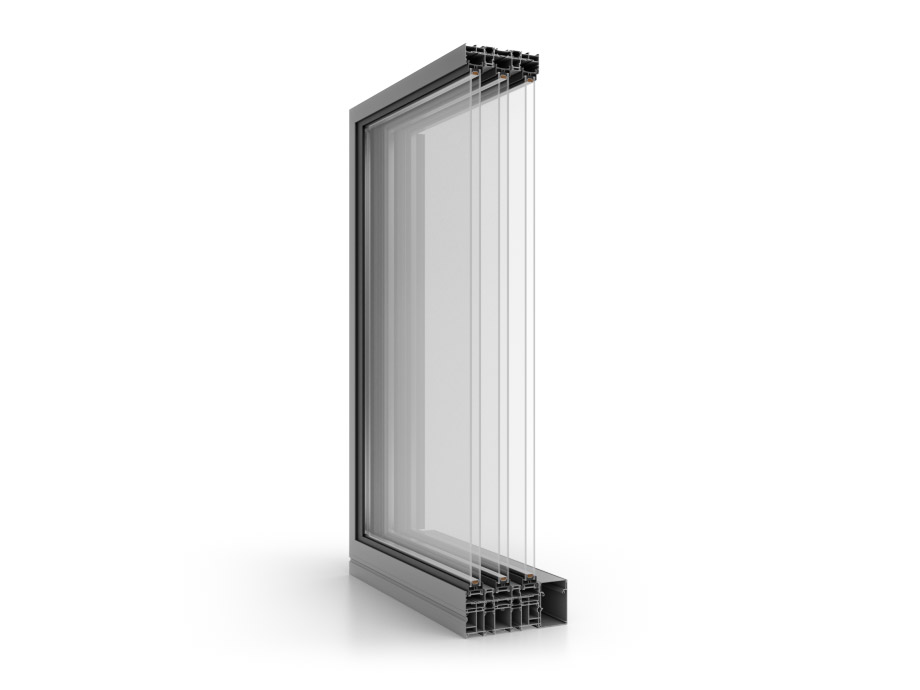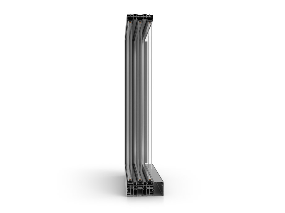 Eine Besonderheit des Systems ist die verstärkte Inox-Schiene, die die Möglichkeit bietet, größere und schwerere Türflügel zu verwenden, und die ein sanftes Gleiten ermöglicht, um die Lebensdauer des Systems zu verlängern. Sie ist eine wesentliche Voraussetzung für die Realisierung der dreispurigen Variante.