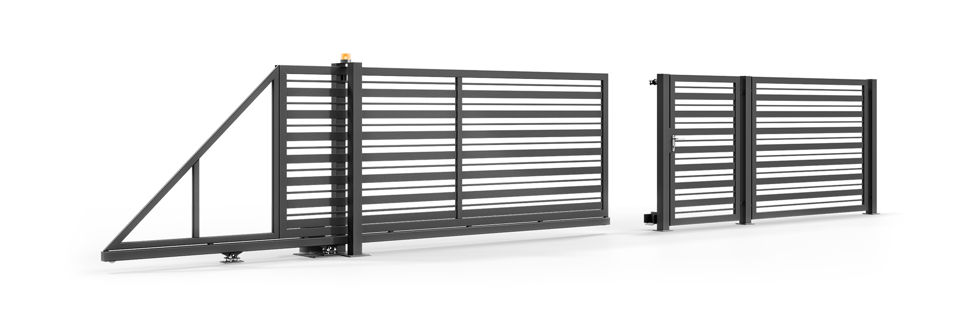 - Zaunsystem: Pforte, Schiebetor oder zweiflügeliges Tor, Spannweite