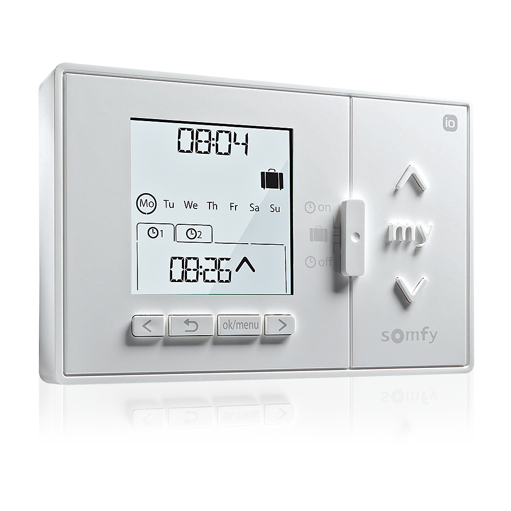 Chronis io ist ein kabelloses, an der Wand montiertes Steuergerät mit Zeitprogrammierung, das die gleichzeitige manuelle oder automatische Steuerung von einem oder mehreren io-homecontrol®-Geräten wie Raffstoren, Rollläden, Beleuchtung, Dachfenster usw. ermöglicht. Der Chronis io Controller kann auf 3 Arten verwendet werden: im manuellen Modus, im automatischen Modus oder im Anwesenheitssimulationsmodus.Die Ausgabe stellt kein kommerzielles Angebot dar. Die dargestellten Bildmaterialien dienen nur zu Illustrationszwecken und die tatsächlichen Farben und Strukturen der Produkte können von den in den Werbematerialien dargestellten abweichen. Die dargestellten Illustrationen, einschließlich der Farbdarstellung, können keinen Grund für eine Reklamation darstellen. Die Renderings zeigen Beispiele für Profil- und Verglasungskombinationen.