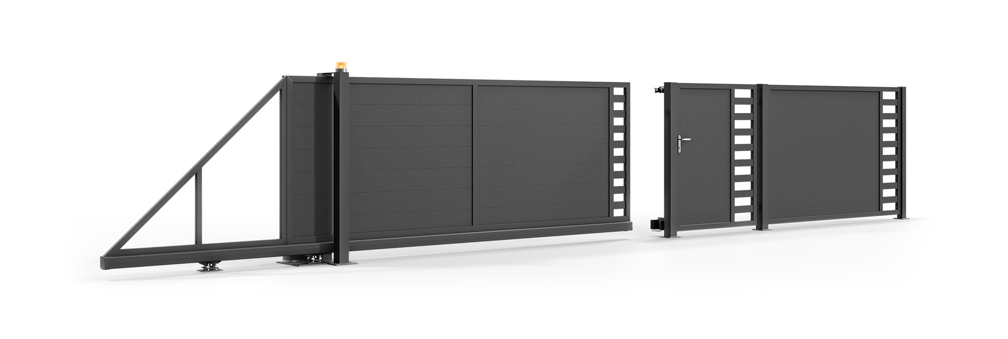 • Zaunsystem: Pforte, Schiebetor oder zweiflügeliges Tor, Spannweite